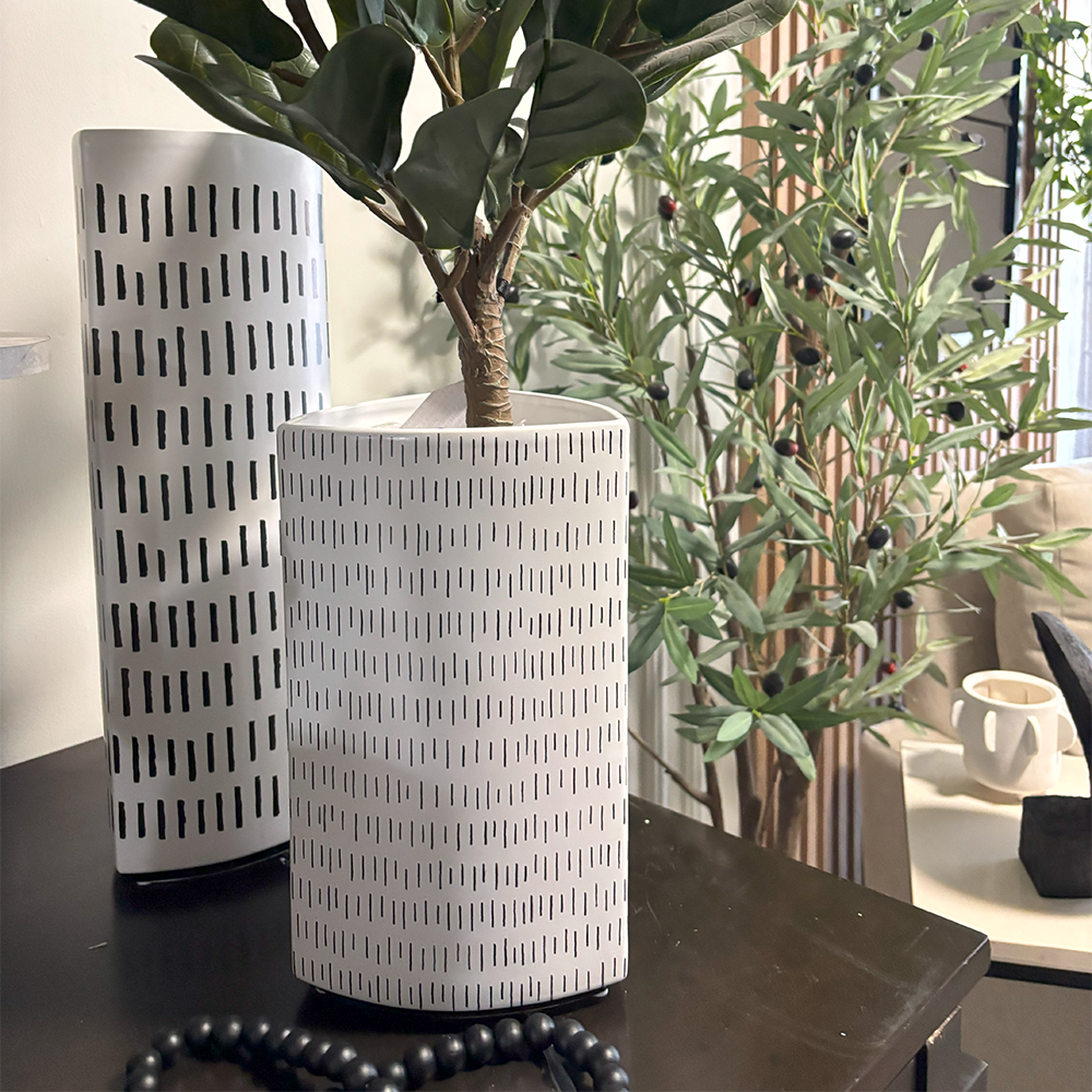 Jarrón decorativo de cerámica esmaltada color blanco con líneas irregulares negras, perfecto para dar un toque moderno y elegante a tu hogar. Su diseño artesanal aporta estilo y personalidad, realzando salas, recámaras u oficinas con una pieza única y sofisticada.